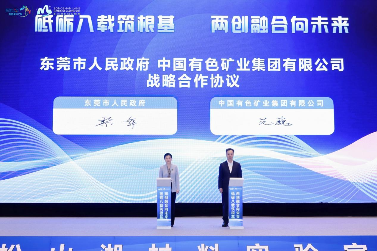 大会上,文岗和东莞市委书记韦皓共同为中色创新研究院东莞松山湖分院揭牌。会上还签订了《东莞市人民政府中国有色矿业集团有限公司战略合作协议》和《东莞松山湖中色创新研究院高温超导试验验证基地项目合作协议》。